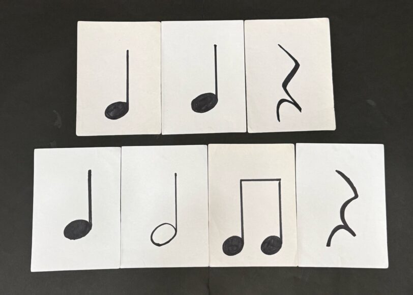 ピアノは音の名前とリズムが分からないと弾けないことを説明。体験の時は2種類のカード(リズム、休符、各1種類)のみでしたが、今日はそれにリズムを2種類を追加してチャレンジ。初めてのレッスンですが、4種類のカードを入れ替えても正しくリズムが叩けました!