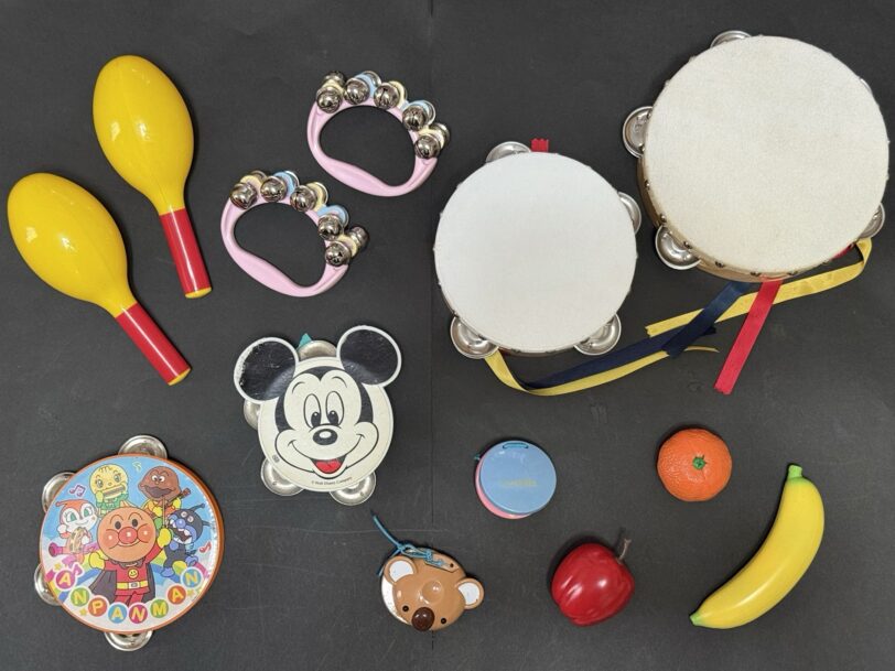 楽器も曲ごとに変えたのですが、ミッキーやアンパンマンのタンバリンを叩きこれは響きが違うという表情をし(オモチャなので音がカシャカシャする)別のところに置いてあったタンバリンを指し「僕は本物のタンバリンでやる!」と言い、私としてはニセモノ、本物というつもりで使用していなかったのですが、叩いて「これこれ、、」の納得の表情に音の響きに興味があることが分かり、小さい子とは違ったところに興味を示したDくん。次にリズムカード。