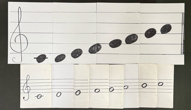 そして、音名を覚えるため音名カードをスタート。体験では歌ったり、ピアノを弾いたりはしましたが、「この音符はド、この音符はレ」のように音名と音符を結びつけるのは初めて。まず、音階を書いたもの(上段)を見ながら、同じと思う音符のカード(下段)を選んでいきます。でも初めてのDくんにとっては線があり、その上に○があるだけに見えるよう。そこで、「何番目の線と何番目の線の間に○がある?」「何番目の線にお団子みたいに○がささっている?」と声をかけると自分で「これ!」とカード選びがスムーズに。今日は始めのドとレのカードと5線紙(5本の横線で楽譜を示す)の上から数えて3番目下から数えても3番目の線の真ん中にある〝シ“は覚えてほしかったので、「次のレッスンで始めに真ん中の音、おへその音は?」て質問するから忘れないでね、「大丈夫?」と聞くと「うん!」と元気に返当。
