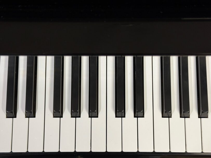 「ピアノは黒い鍵盤と白い鍵盤があって、黒い鍵盤が2つ3つ2つ3つ繰り返し並んでいるんだよ」と説明するとじっと真剣に話をきいているAちゃん。「ドの場所は2つ黒い鍵盤が並んでいる左側の黒い鍵盤の手前の白い鍵盤だよ」と説明し、「分かるかな?」と言うと「うん」とうなずくAちゃん。正直、説明している私自身が初めての年中さんには難しいなと思う内容です。「じゃあ、ドを探してみよう!」と声掛けしてチャレンジ。「2つの黒い鍵盤はここだよ」など少し助けただけで低音から高音まで全部の「ド」を初めてのレッスンで探し当てることが出来、思わず私も「凄いねぇ」という言葉がでてしまいました。その後、リズム練習をしてひとつの音(レやミ)を同じ長さで押すことを出来るようにして、私が伴奏付けし「メリーさんの羊」や「アビニオンの丘」の曲を完成させて演奏。上手に弾いてレッスンを終了しました。