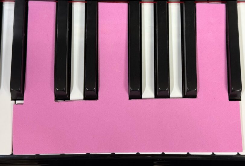 この教材はピアノには黒い鍵盤と白い鍵盤があって、黒い鍵盤が2つ3つと繰り返し並んでいることを知るためのものです。パズルのように鍵盤に色々な色の教材をはめて、「ド」の位置を覚えることに繋げるものです。今では「ド」の位置も覚えて必要ないのですが、やりたい気持ちは大切なので「レッスンの最後にやろう!」と声掛けをしてレッスン開始。